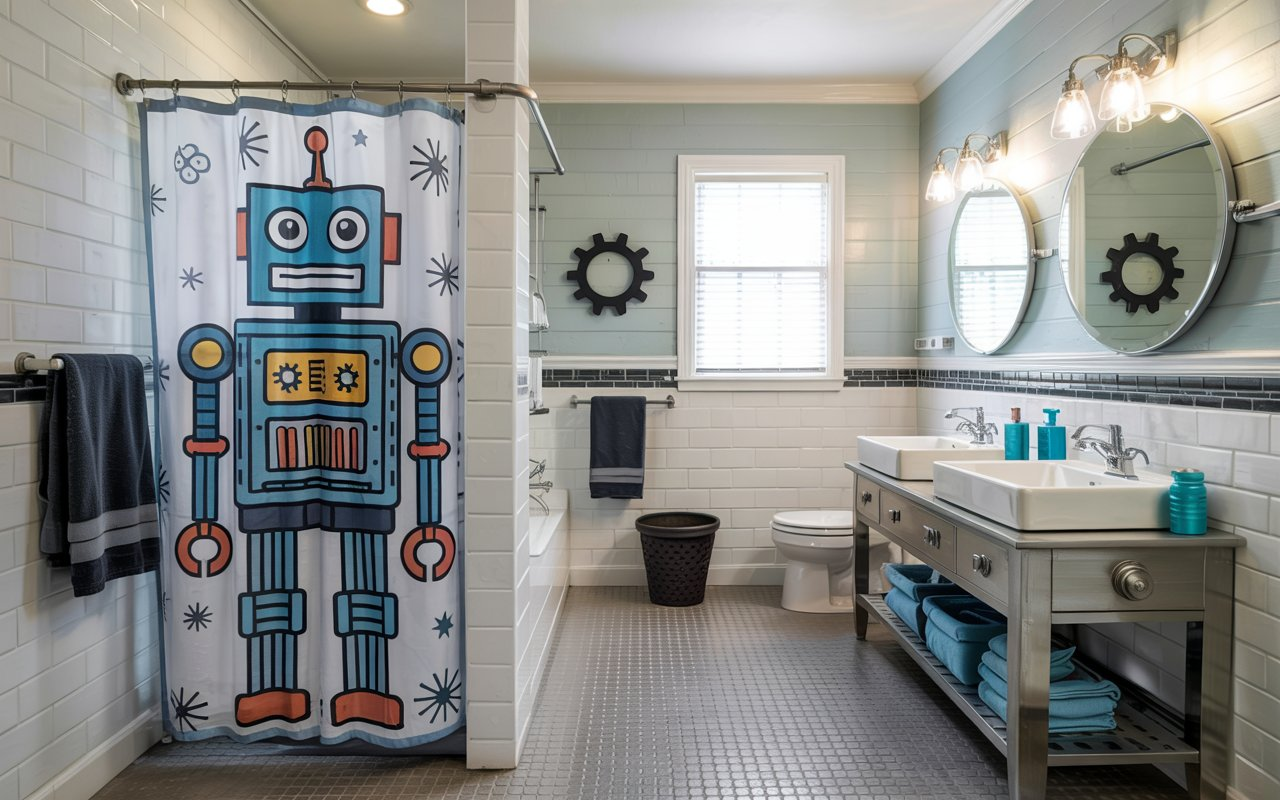 Use silver, gray, and blue for a clean tech-inspired look. Add robot prints on the curtain or wall art. Choose gear-shaped bins or soap holders with buttons.