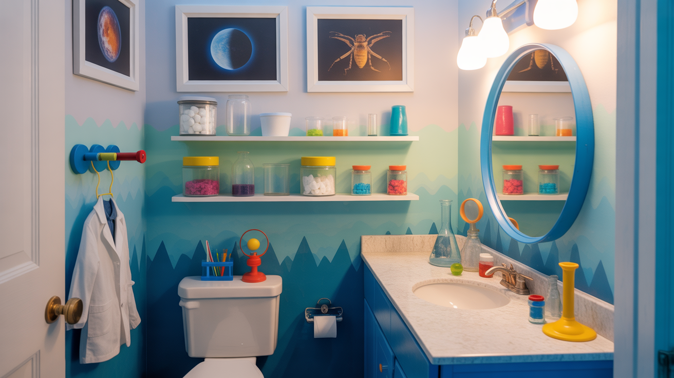 Add a towel hook shaped like a test tube or hang a toy lab coat near the door. This setup is great for curious minds and also helps teach kids to stay tidy.