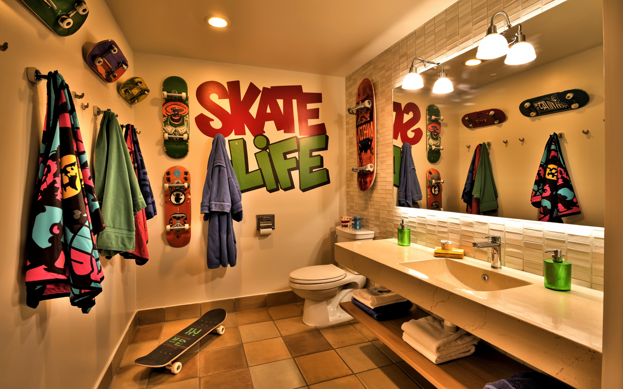 Use an old skateboard deck as a towel rack or shelf. Add wall prints of action shots, graffiti tags, or wheels. Choose bold colors like red, green, and blue for towels and bins.