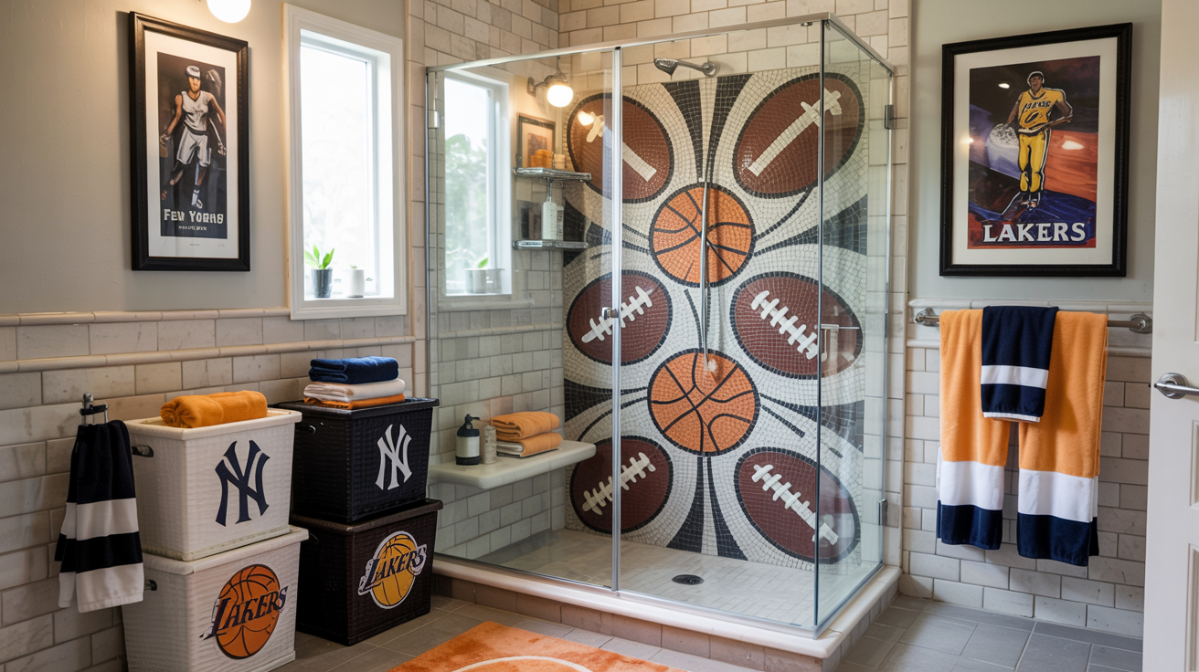 You can hang framed memorabilia, such as jerseys or posters, above the toilet or near the sink. You can also add labeled bins for equipment, such as swim goggles or extra socks.