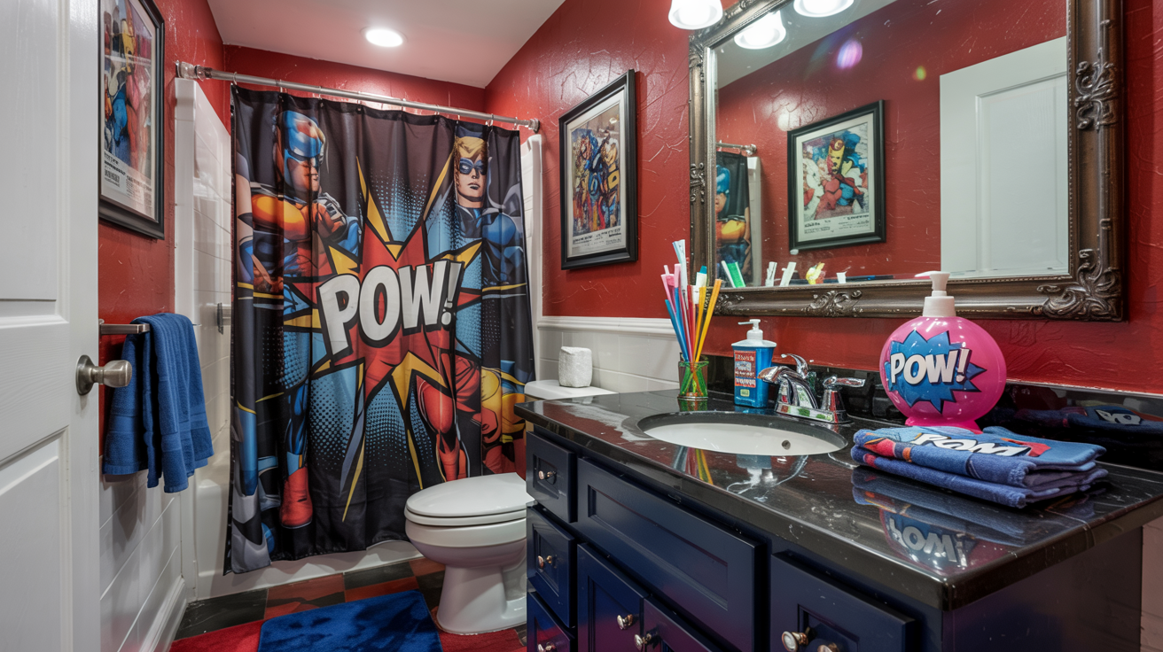 Pick shower curtains with Marvel or DC heroes, and add small touches like themed soap dispensers or framed posters.