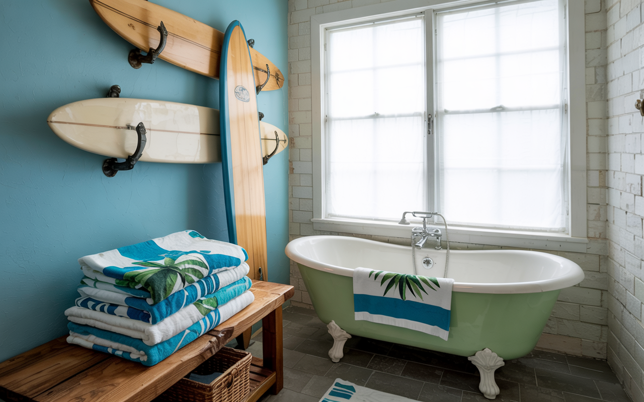 Add surfboard-shaped wall hooks and beach signs. A light rug with shells or waves finishes the look.