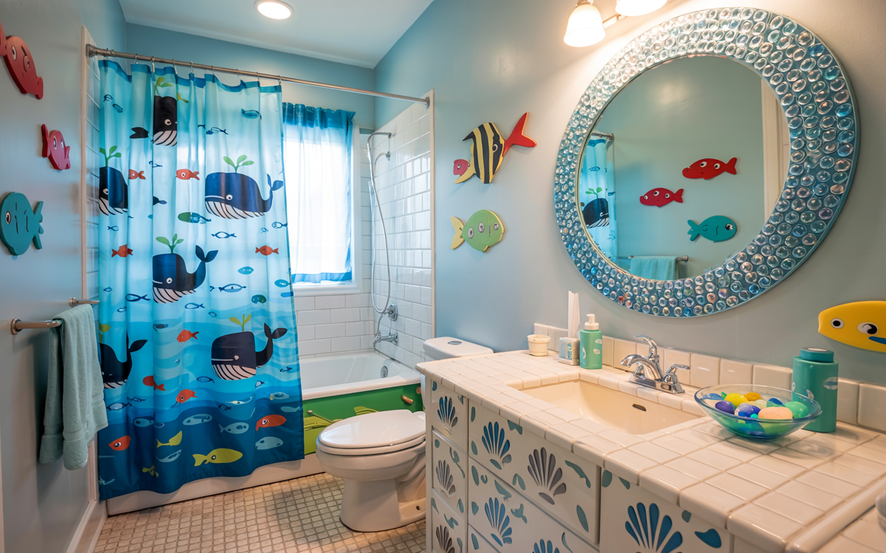 A shell-shaped rug or bubble mirror adds fun without being too much. Use ocean-themed bins for soap and extra supplies. This calm, gentle setup works well for kids of all ages.