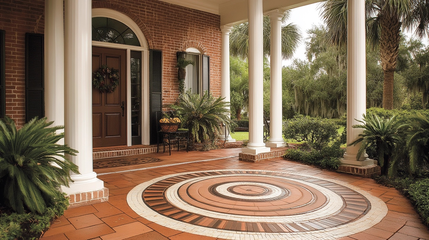 Circular brick pattern porch upgrades a standard entrance into an eye-catching feature through creative brick placement.