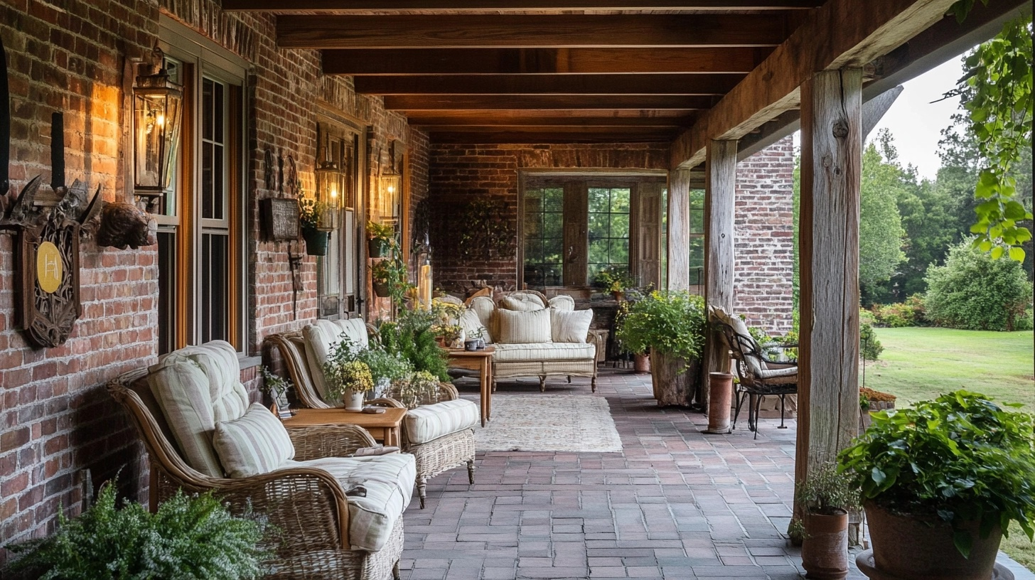Rustic farmhouse brick porch blends natural brick with wooden beams, posts, and furniture for a warm, lived-in feel.