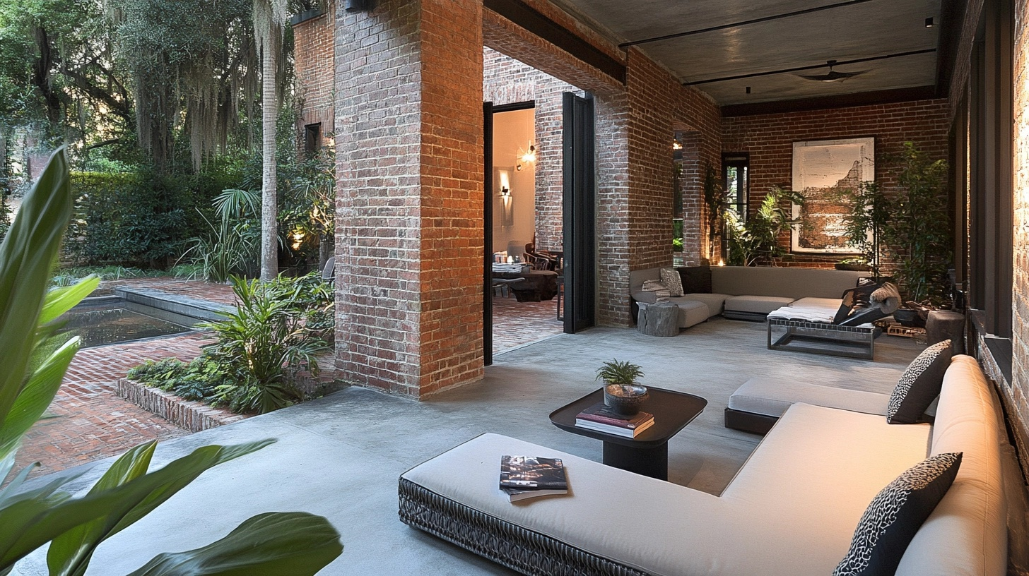 Exposed brick and concrete flooring offer an urban, loft-like feel by pairing raw brick walls with smooth concrete floors.