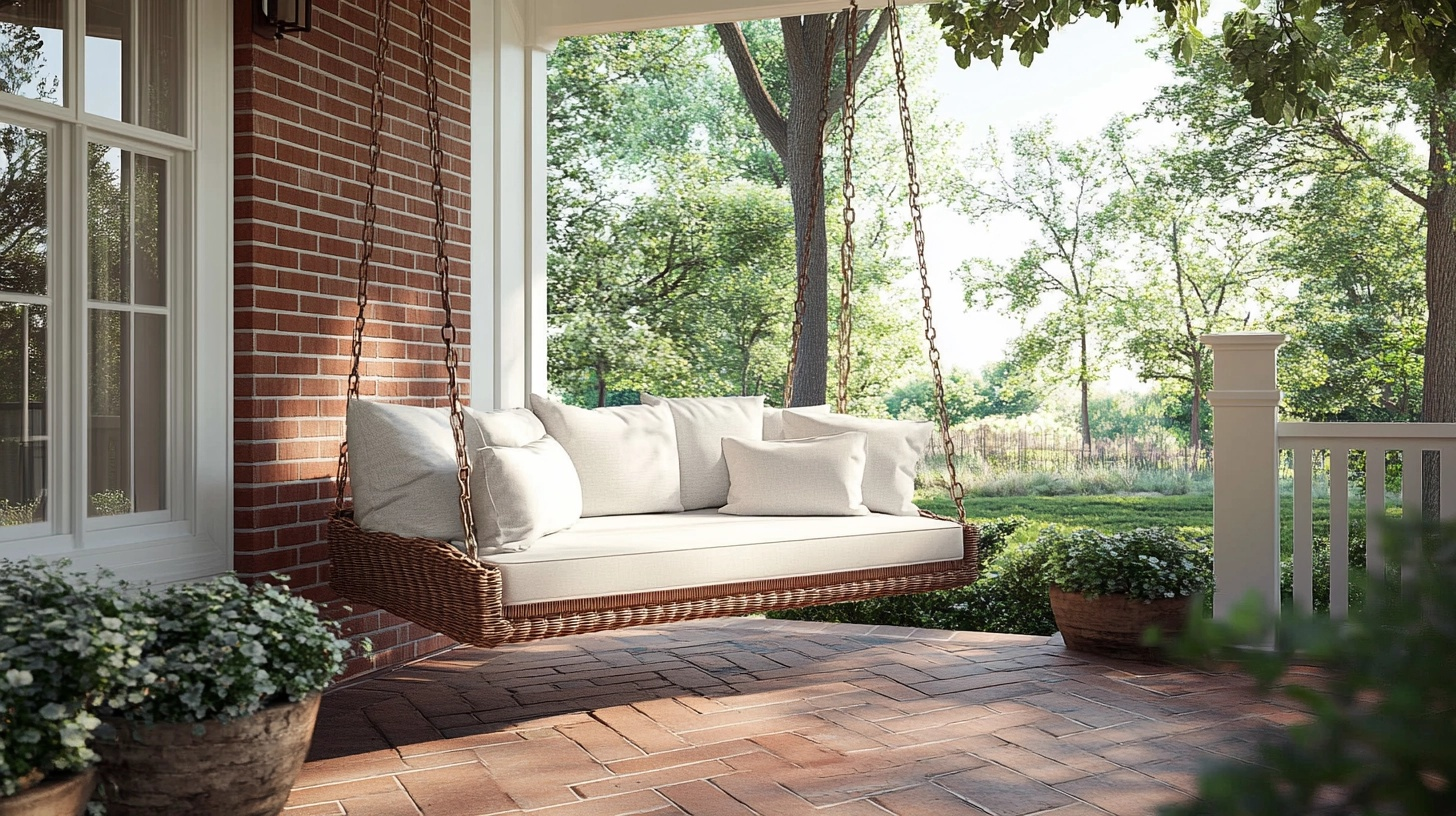 Porch swing with brick foundation creates a cozy spot for relaxation by mounting a comfortable swing onto a sturdy brick structure.