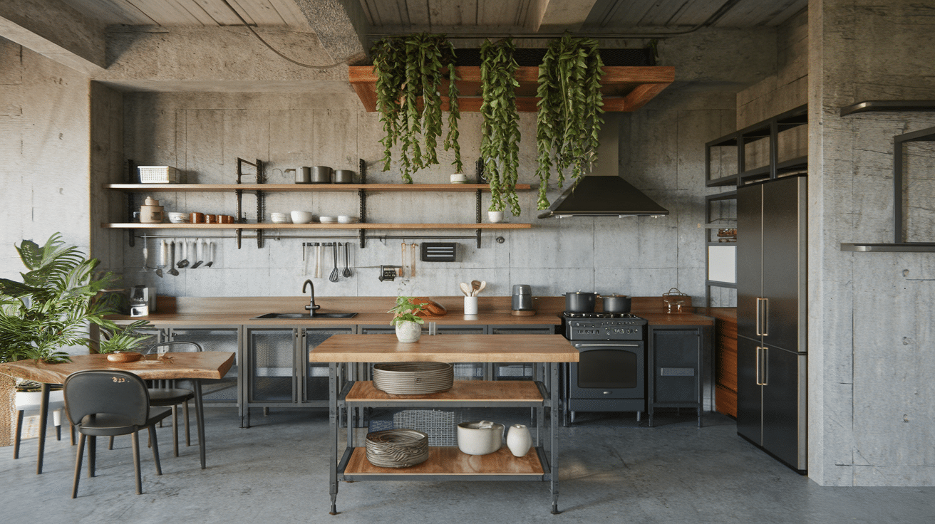 Adding wooden elements like floating shelves or a wooden island can soften the industrial look and create a balanced feel.
