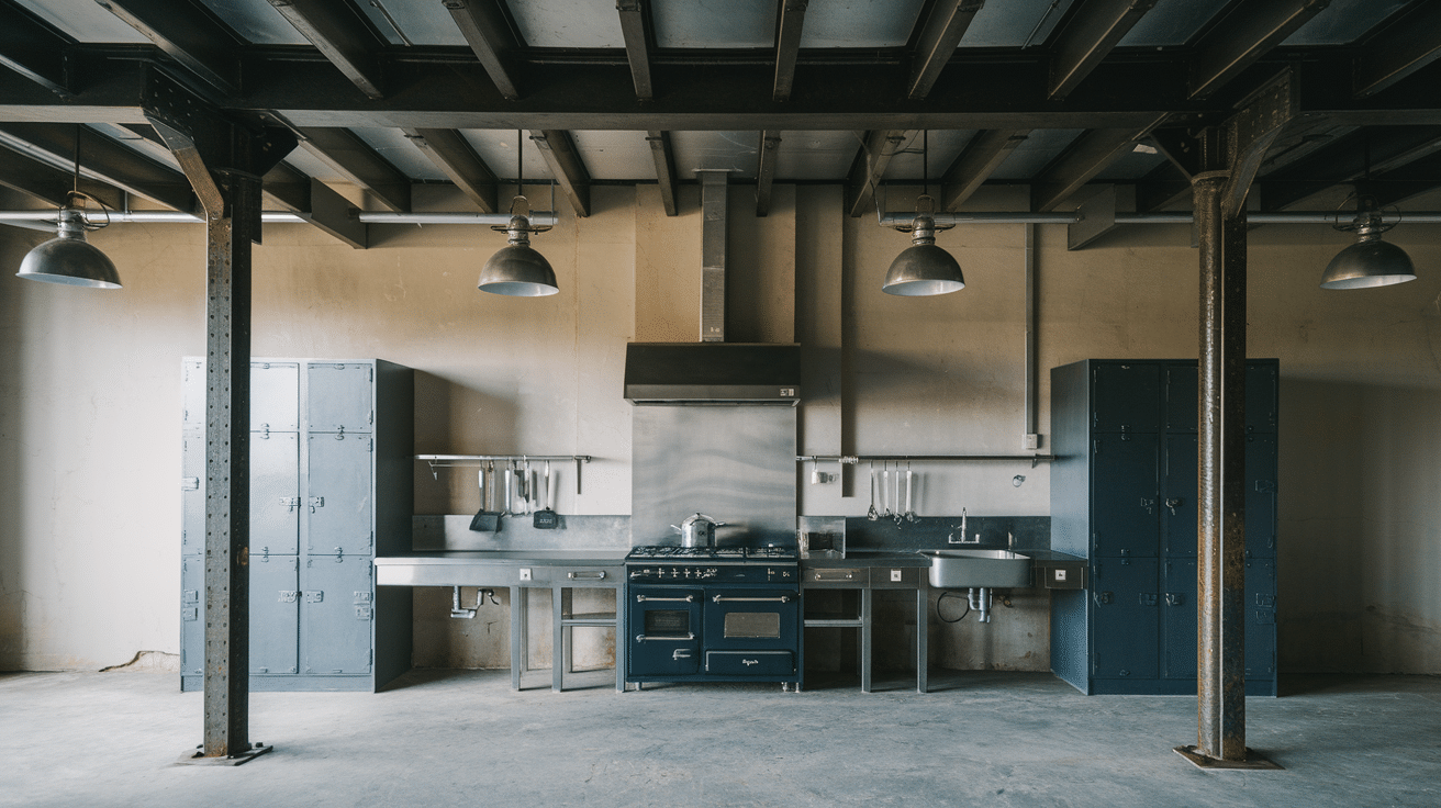 Steel cabinets, large light fixtures, and open shelving add to the industrial feel. This style is not just about looks; it’s about creating a space that’s practical and honest.