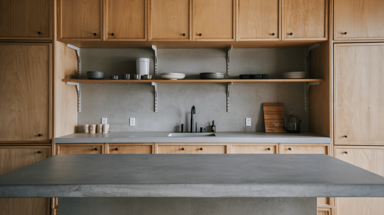 Concrete countertops give the kitchen a strong, rough look. They are durable, easy to clean, and fit well with the minimalist feel of a brutalist kitchen.