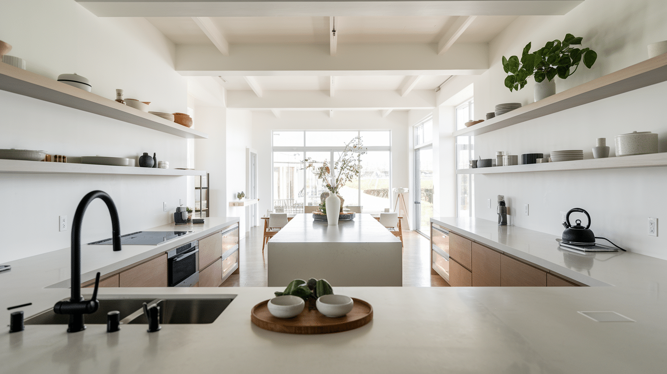 The goal is to keep things simple, so opt for sleek, minimal furniture and shelving. A central island is a great addition for functionality, offering storage and workspace without cluttering the room.