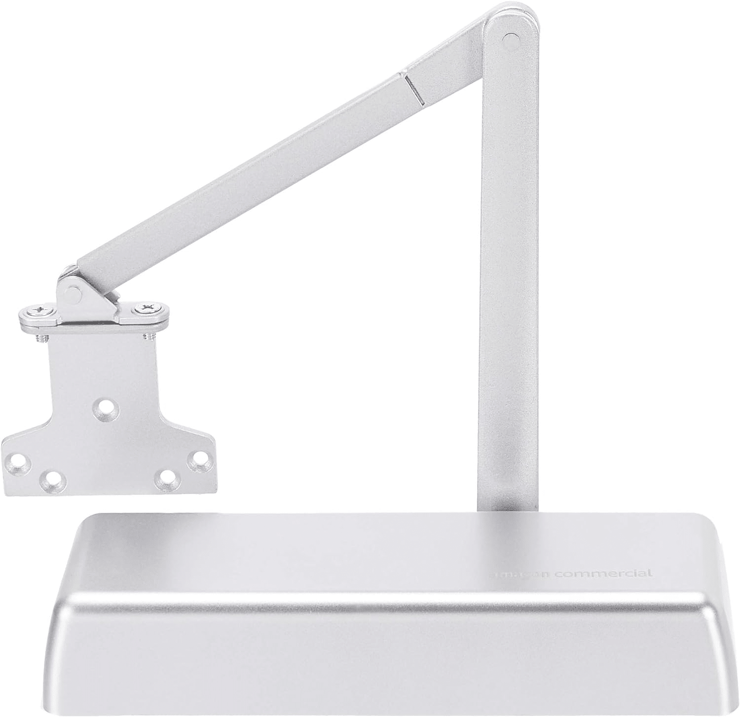 This heavy-duty commercial door closer (size 1-6, Silver, 1-pack) has a standard arm, PA bracket, and plastic cover, making it excellent for office buildings, hotels, and retail locations.
