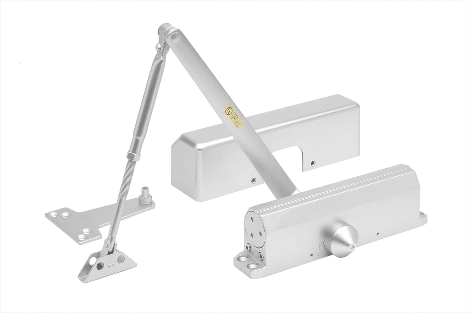 The heavy-duty door closer has three valves that control closing speed, latching speed, and backcheck. Every commercial door closer package we offer includes all of the necessary hardware, including as brackets and soffit plates, for installation utilizing any of the three mounting methods.