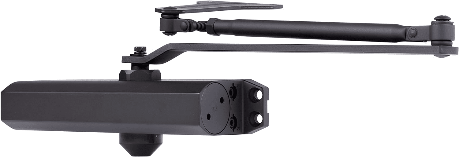 Fully adjustable with 6 power levels and two separate valves to control the latching and closing speeds; totally reversible without adjustment. Surely it is the best heavy duty door closer for steel doors. Durable cast-aluminum body with a rust-resistant steel arm and steel internal components, a heat-treated piston and spindle, high tensile strength alloy steel springs, stable fireproof hydraulic fluid, and efficient needle bearings.
