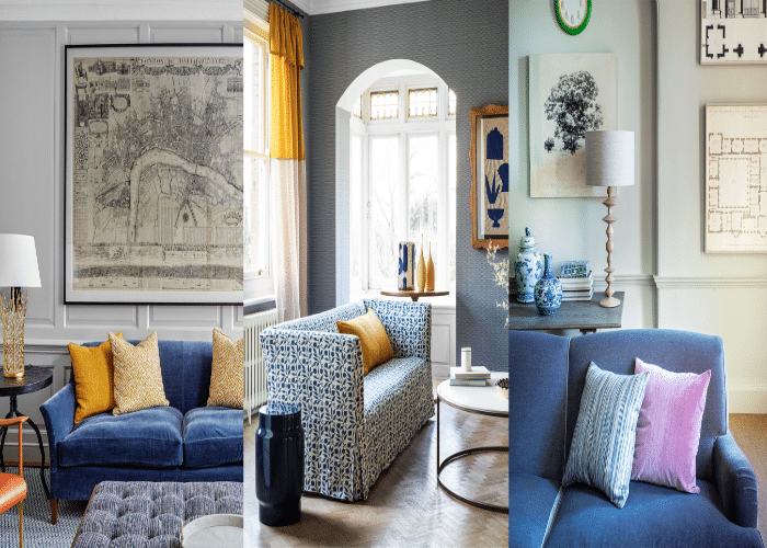 A wide range of wall colors complements blue furnishings. Navy blue couches complement a wide range of wall colors, like pastels with white borders to bolder tones like orange, lime green, and red.