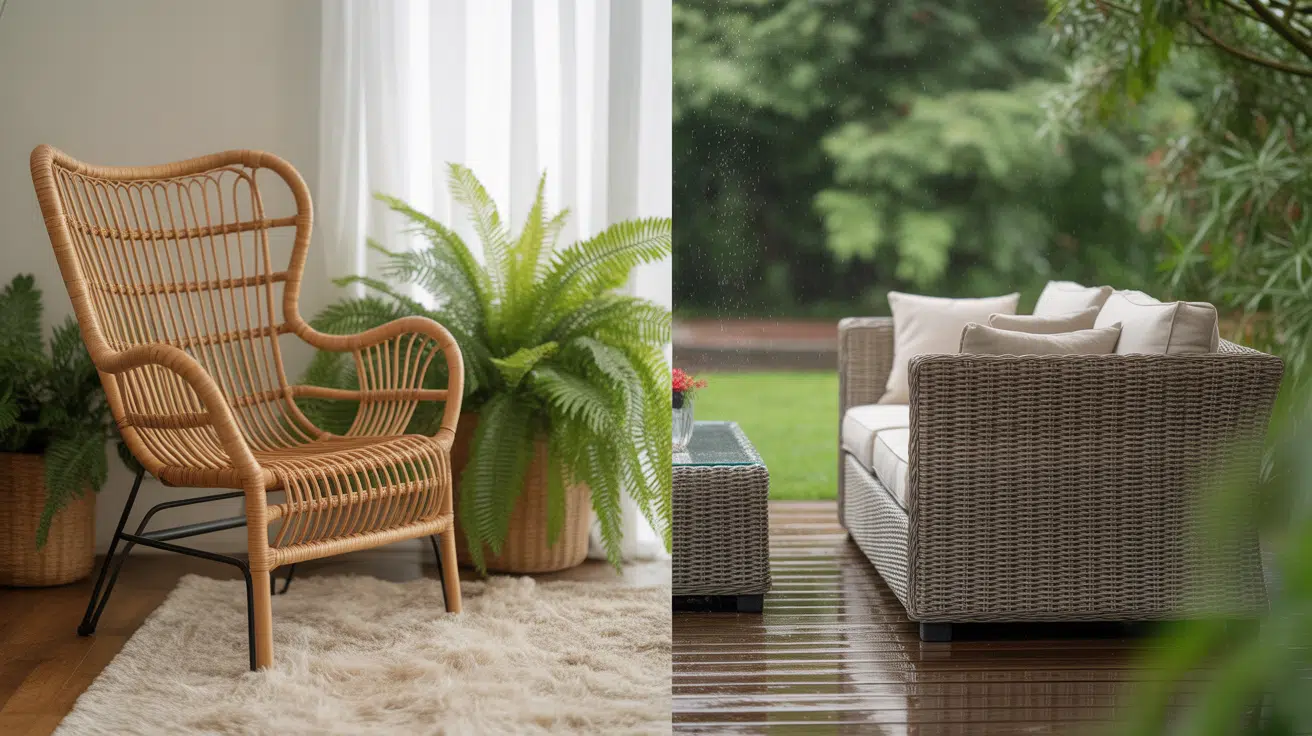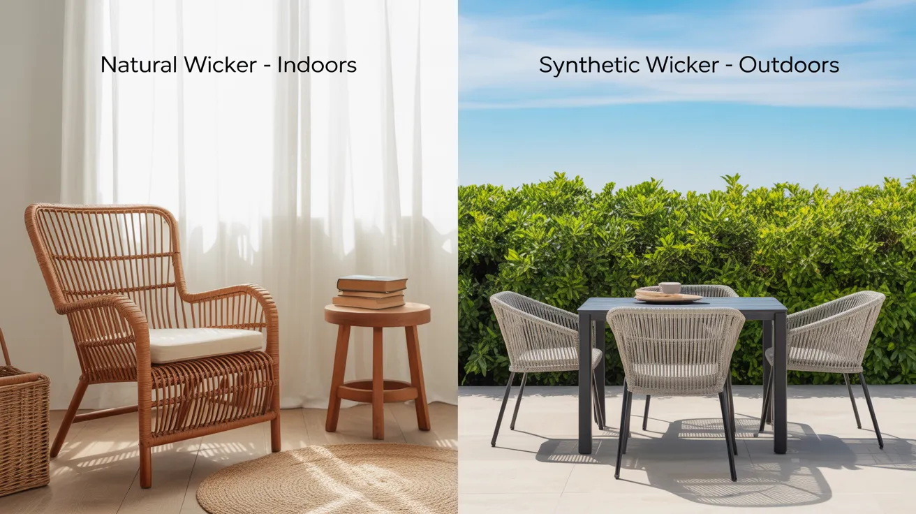 Natural wicker is made from plant fibers and needs dry spaces. Synthetic wicker is plastic-based, made for outdoor use, and handles weather better. Each has different care needs and durability.