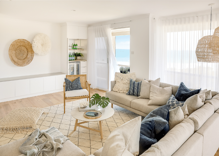 Combining various textures such as wool blankets, nature fiber rugs from linen upholstery, and leather accents add richness to your coastal lake house decor. Layering these textures creates depth and visual interest in this space, making it feel cozy and inviting.
