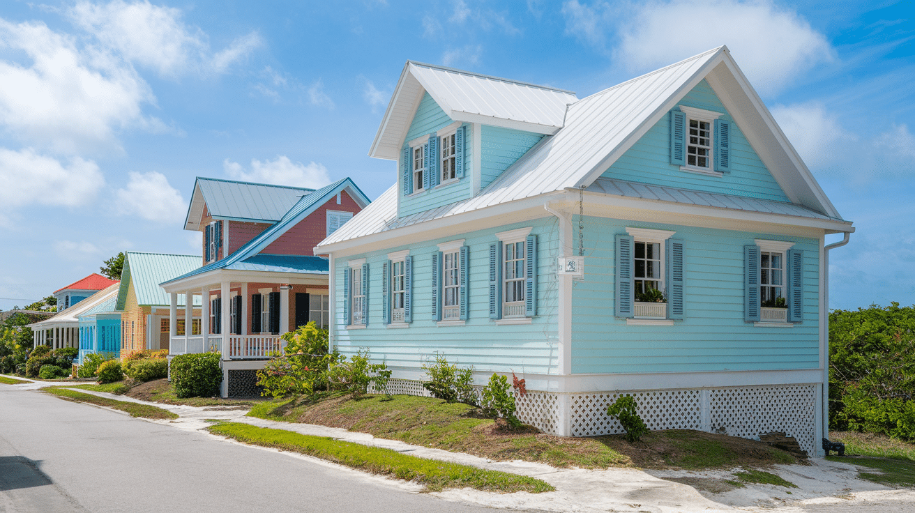 The Bahamas has a unique style with clapboard homes painted in soft pastel colors and white roofs that reflect heat.