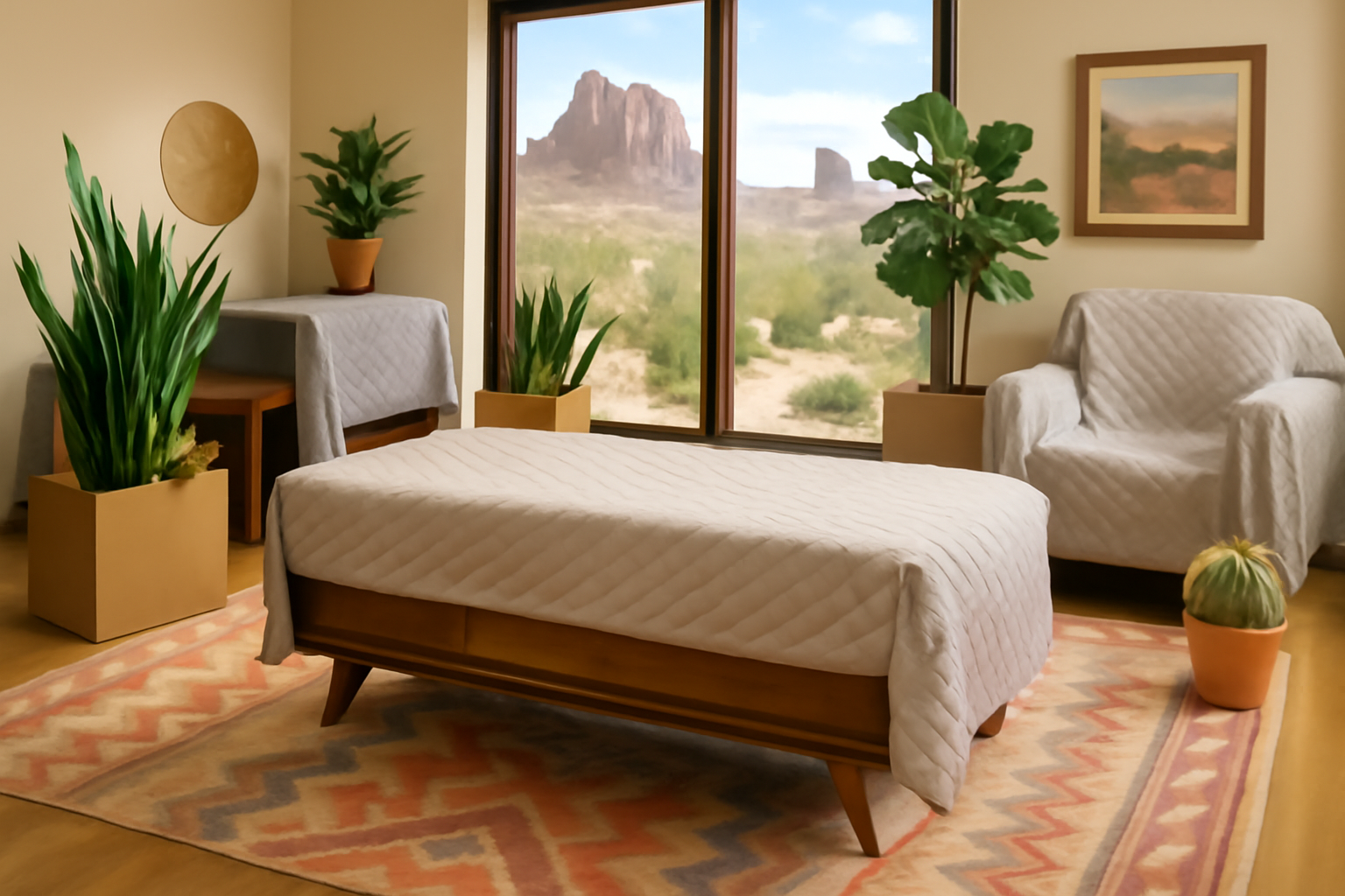 Southwestern home interior prepared for climate-safe moving with protected furniture and plants