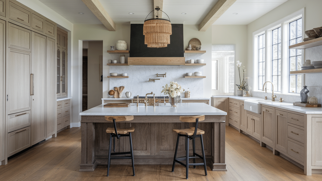 The blend of coastal and farmhouse styles creates kitchens that feel both fresh and lived-in. This mix brings together beachy brightness with country warmth for spaces that welcome family gatherings and everyday cooking.