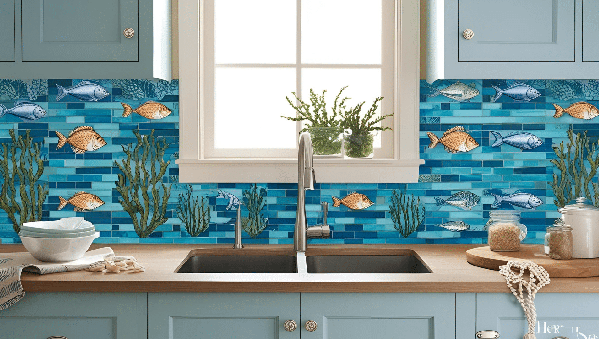 Want to bring a bit of ocean magic to your kitchen? An underwater-themed, colorful mosaic tile backsplash can do just that. These designs feature fish, coral, and seaweed in calming blues and greens, making your kitchen feel like a peaceful seaside retreat.