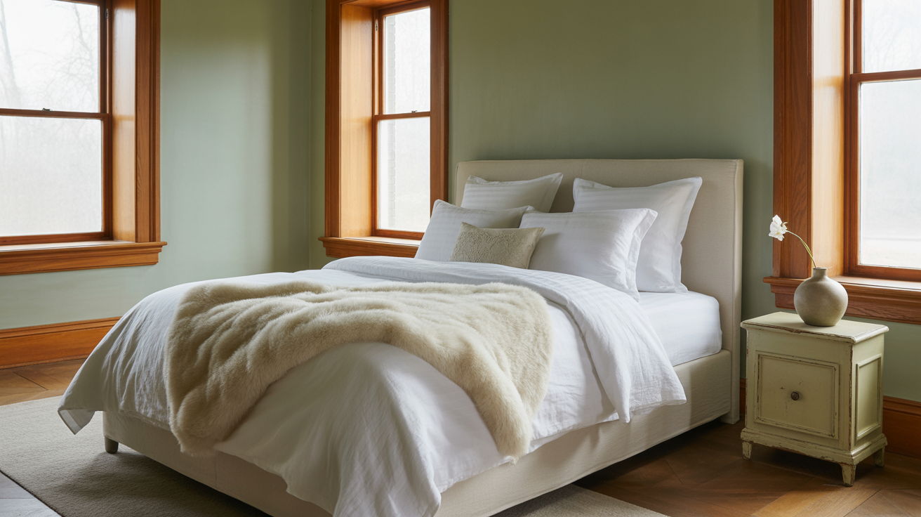 Greige, muted green, and soft blue bring calm to oak-trimmed bedrooms. These colors help the wood recede so the room feels peaceful and easy to relax in. BM October Mist 1495 will be a good fit.