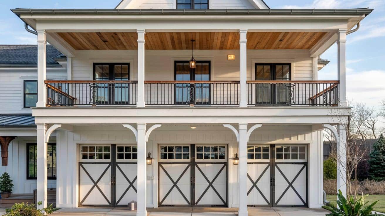 Balconies in modern farmhouse designs offer both function and style. Simple metal railings with thin vertical bars maintain views while ensuring safety. Second-floor porches with wooden columns create usable outdoor spaces that extend living areas.