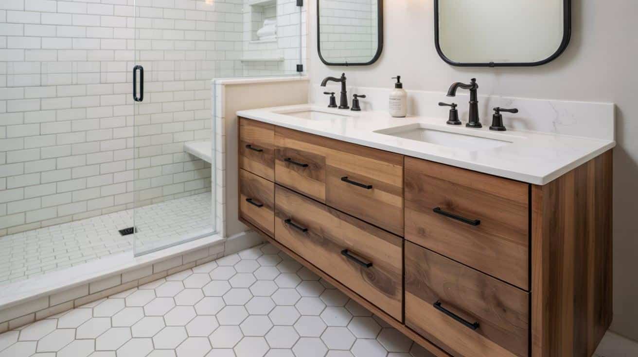 Custom vanities bring personality to modern farmhouse bathrooms. Walnut vanities with their rich, warm tones create a grounding element against lighter walls.