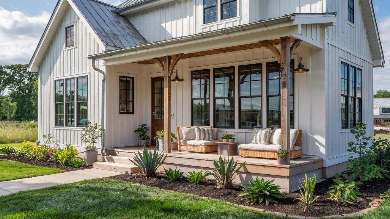 The modern farmhouse style gains street attention through simple, clean design elements. White siding serves as a bright, fresh base that reflects light and creates a sense of openness.