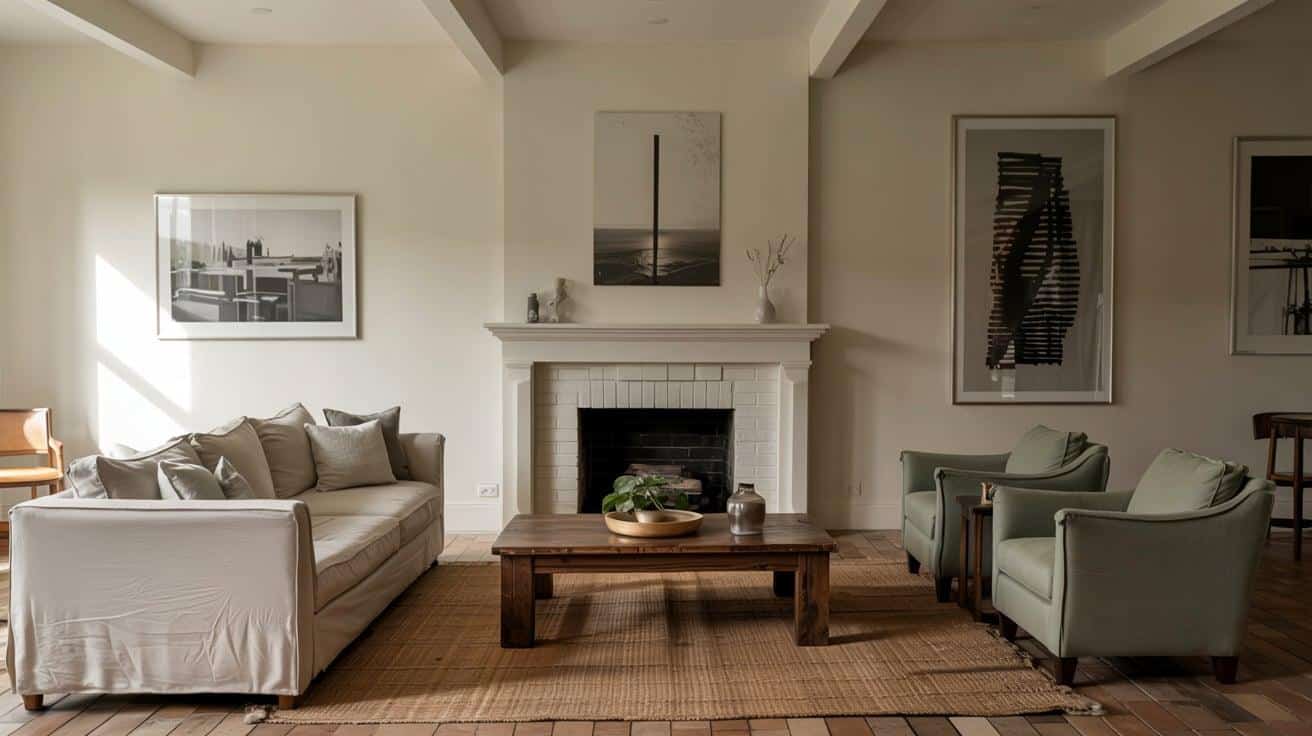 These larger pieces work best balanced with wooden coffee tables that show natural grain patterns and knots. Armchairs in warm, earthy tones, such as sage green, rust, or navy, add subtle color while maintaining a calm feel.