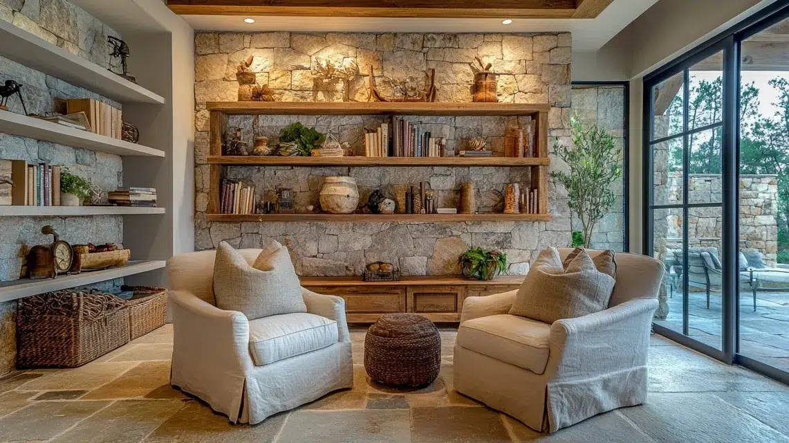 If you have a stone wall, let it show. Don’t cover it with paint or heavy curtains. The rough texture gives your living room a natural feel.