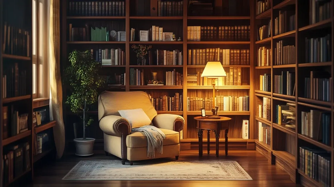 A warm lamp nearby helps make the space feel calm. This corner can be your quiet spot after a long day. Wooden shelves are useful and also help your room feel more like home.