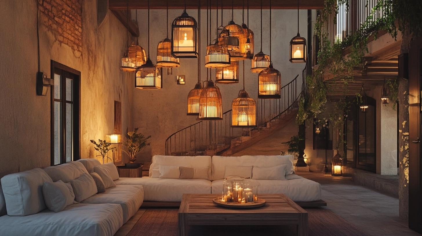 Use lantern-style lights made of metal or wood. Hang one from the ceiling or place small ones on side tables. They give off a warm glow that makes the room feel calm and quiet.