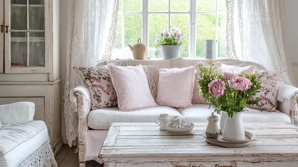 Use soft-colored old furniture like white, pale pink, or light green. Add cushions with little flower prints. A coffee table with a worn-out look adds personality.