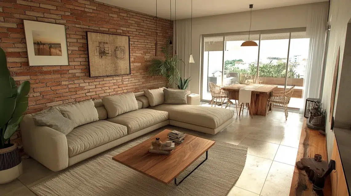 Let the brick wall stay just as it is. Don’t cover it with paint or panels. It adds texture and makes the room feel solid. Add soft furniture nearby, like tan or beige couches.