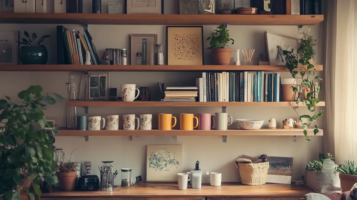 Use open shelves to show off books, old mugs, or little family items. Choose wood shelves for warmth. Keep things neat and not too packed.