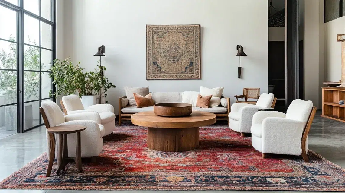 Place a large rug with an old-style pattern in the center of your room. Choose faded colors like red, navy, or tan. It sets the tone for the rest of the space.