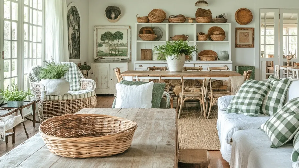 Use a big wooden table, old-style chairs, and soft checkered pillows. Woven baskets are great for holding things and also look nice.