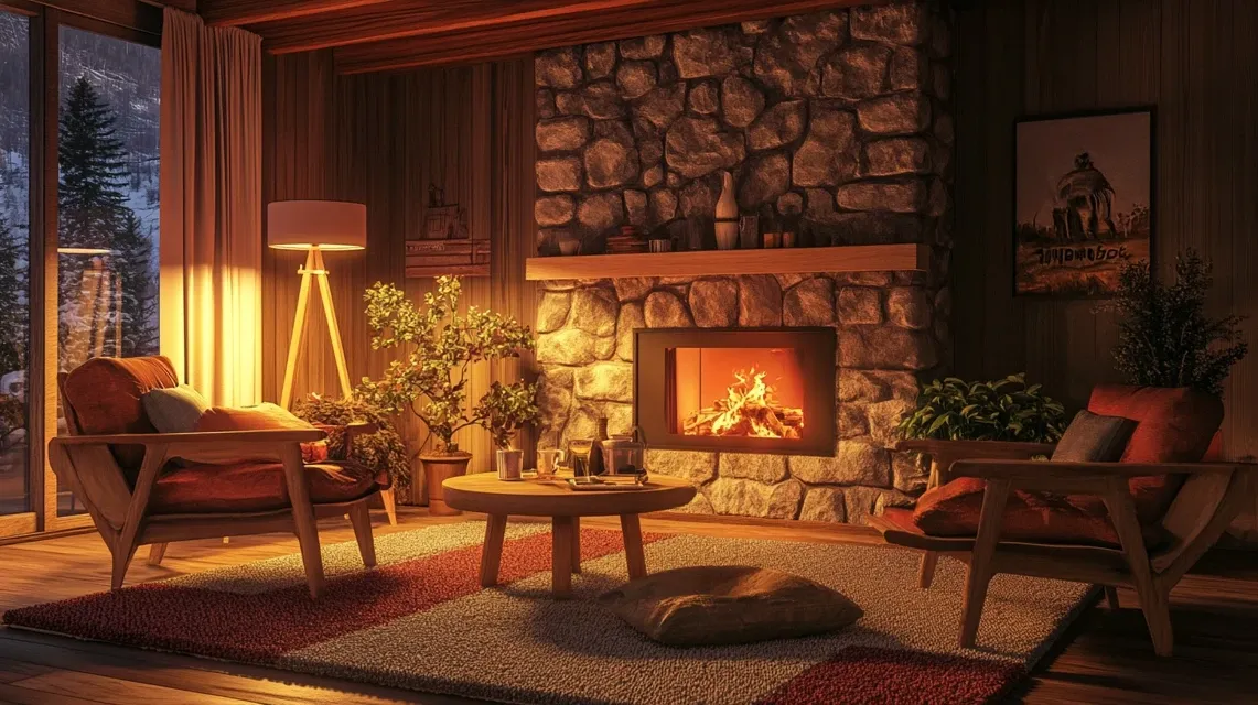 Add warm blankets and a soft rug. This setup makes your living room feel like a small mountain cabin. It’s perfect for relaxing with a book or having quiet chats on chilly evenings.