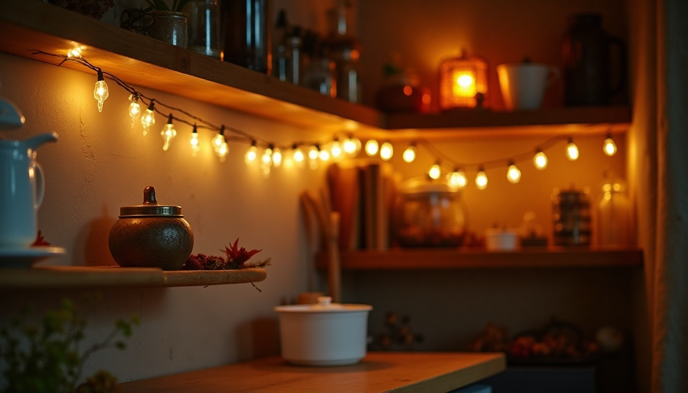 Wrap warm-toned string lights around open shelving or above cabinets for a soft glow. It creates a cozy atmosphere, especially in the evening. Battery-powered lights are easy to place and don’t need outlets.