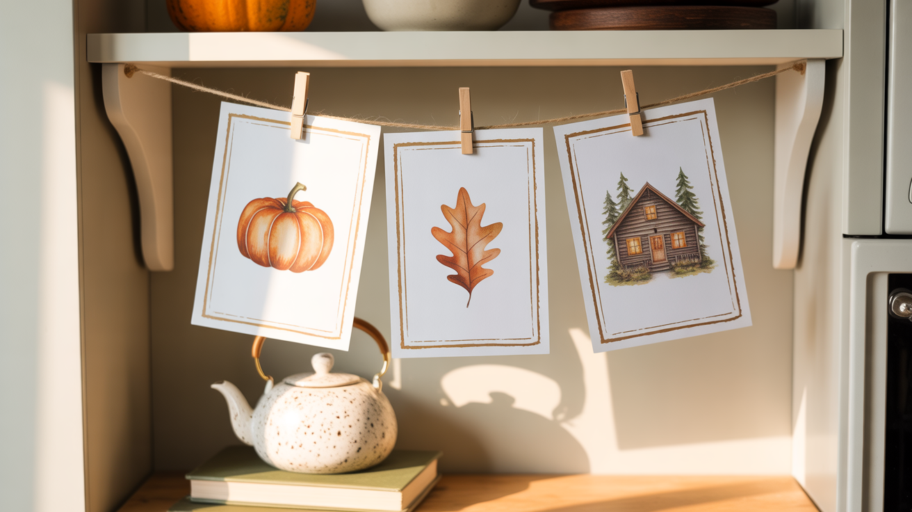 Print fall quotes or illustrations and clip them to open shelves or the fridge with mini clothespins.