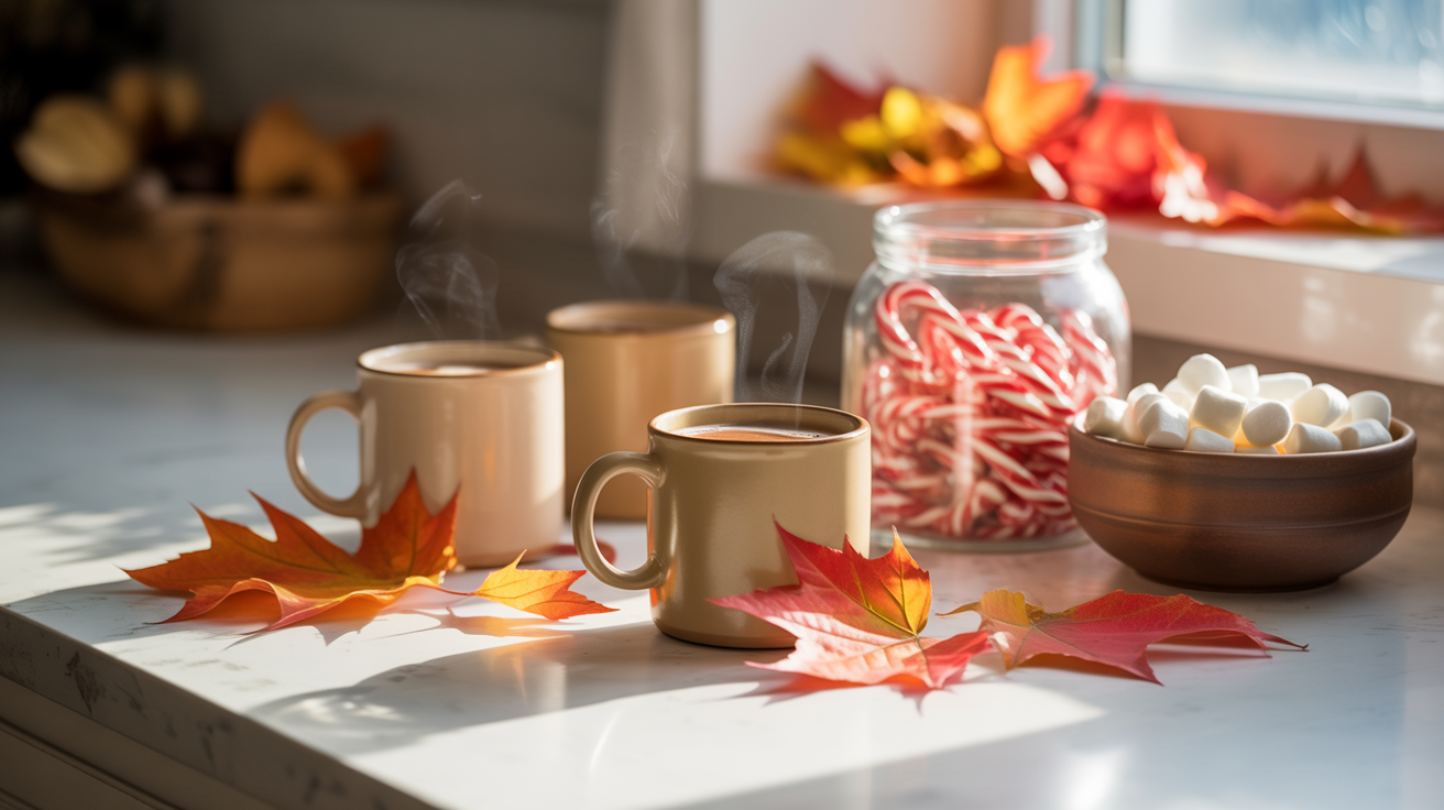 Set up a coffee or cocoa corner using fall-themed mugs, a jar of marshmallows, and some candy sticks. Check out fall mug sets on Etsy or in local shops.