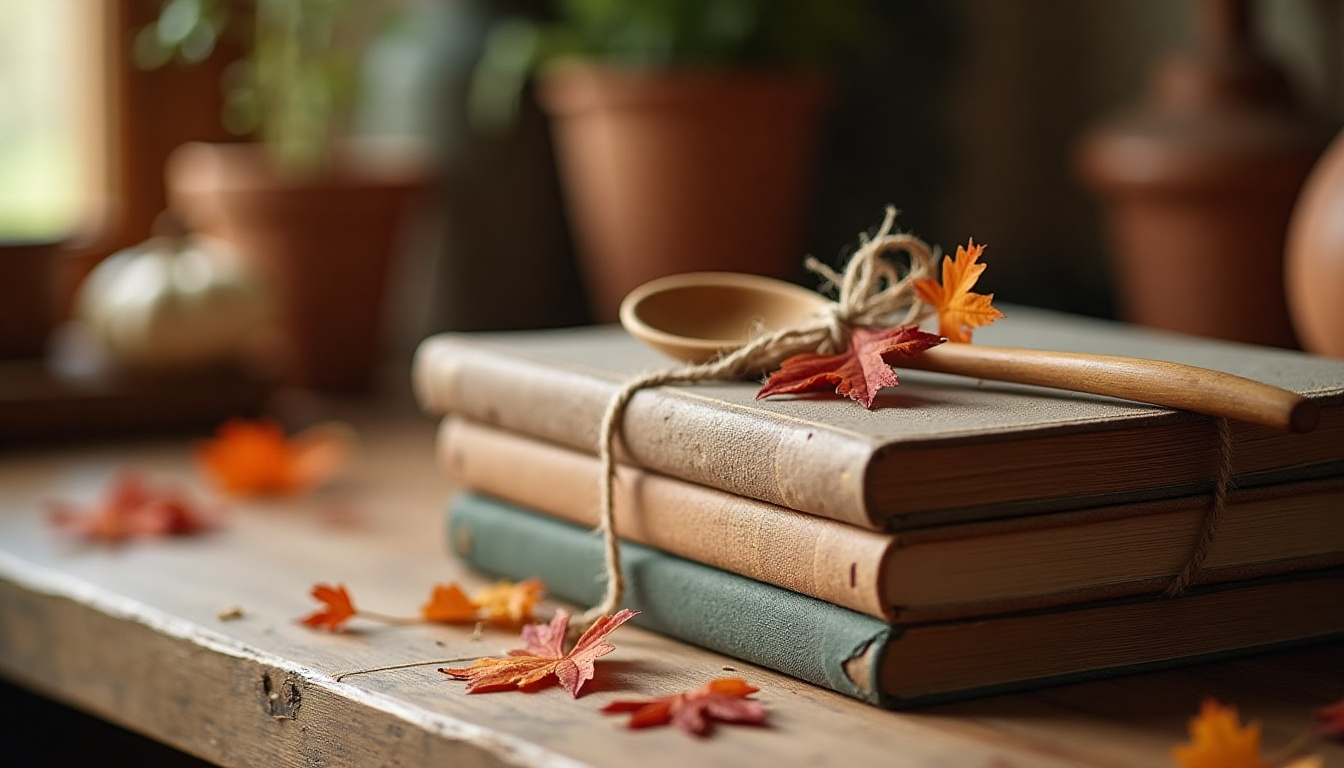 Stack one or two fall cookbooks with a wooden spoon tied in twine. Place them near your coffee maker or cutting board for a cozy look. Check thrift stores or used bookstores for cheap seasonal cookbooks.