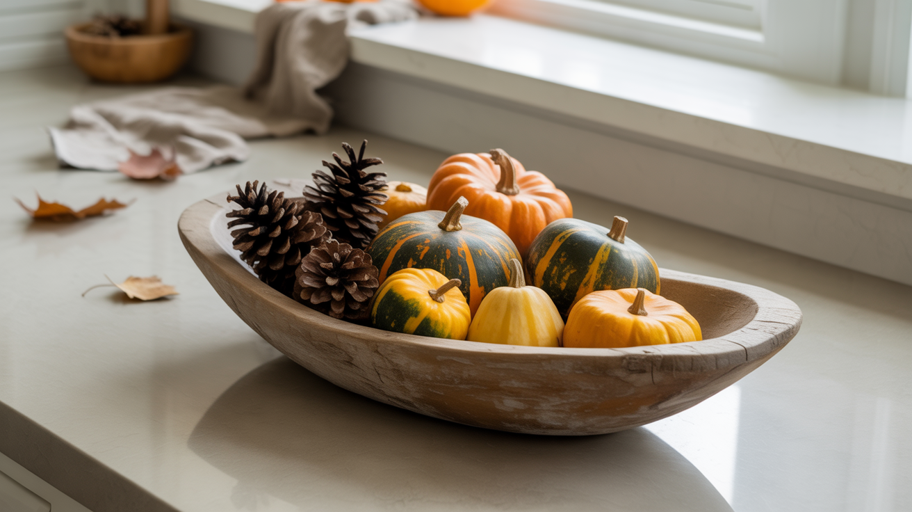 A wooden dough bowl works great on islands or tables filled with pinecones, faux gourds, or acorns. Collect naturals outside or buy filler packs from craft stores or online.