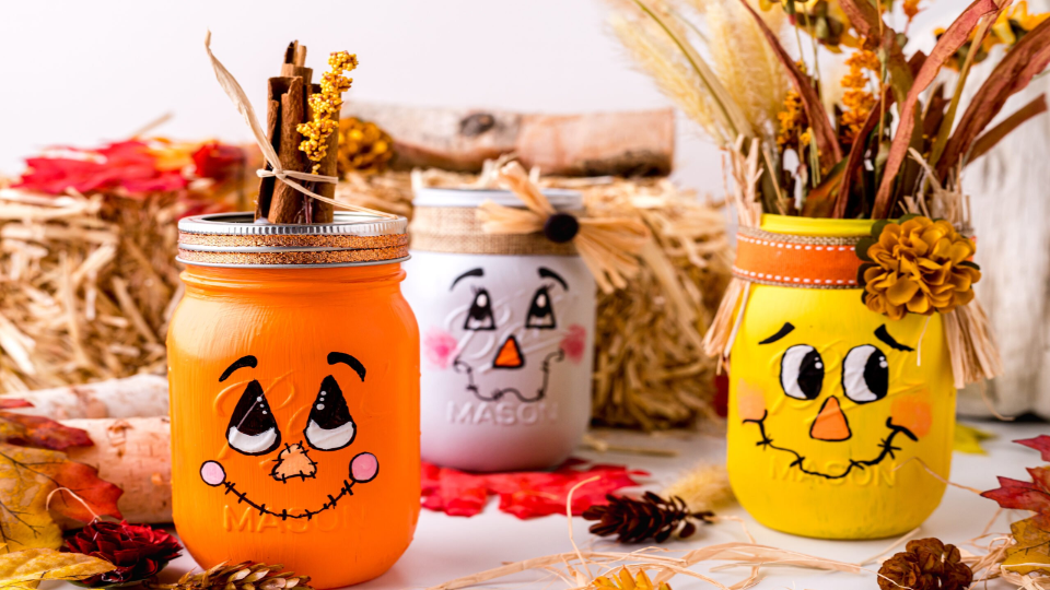 Start with clean, dry jars and use chalk or acrylic paint in warm tones. Apply two thin coats, letting each one dry completely. Wrap twine around the top or glue on small leaves for a little extra texture.