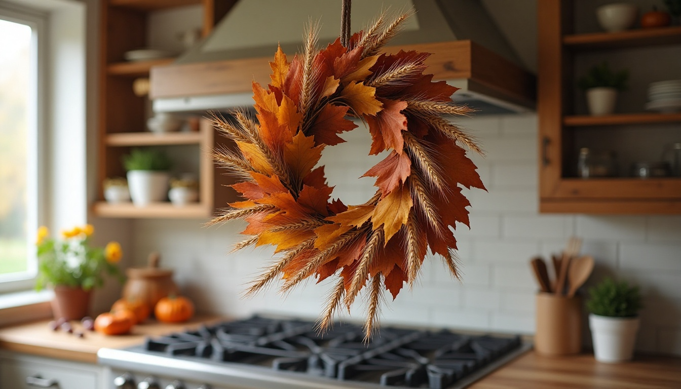 Hang a small wreath made from leaves, wheat, or mini pumpkins. Pick one that fits your color scheme or make your own with hot glue. Command hooks or magnetic wreath holders work well in kitchens.