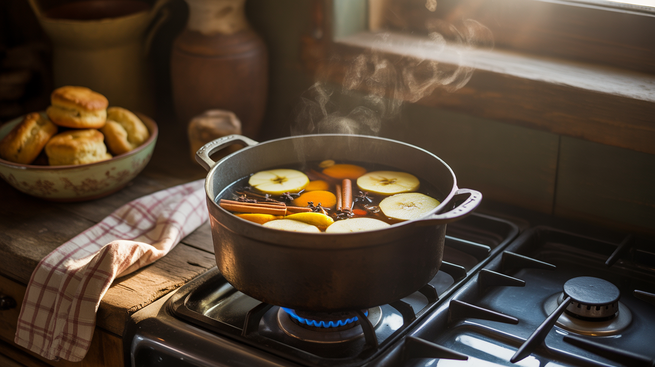 Add sliced apples, orange peels, cinnamon sticks, and cloves to a pot of water. Let it simmer gently on low heat and top off the water as it evaporates. The steam spreads a natural, soothing smell through your space.