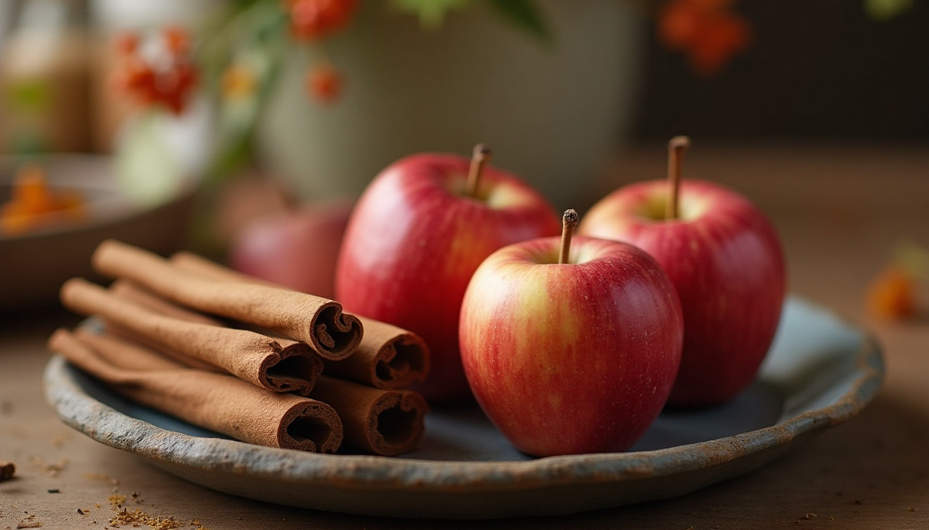 Use a shallow dish or basket and arrange fresh apples with bundles of cinnamon sticks tied in twine. This adds natural scent and costs very little if using pantry items.