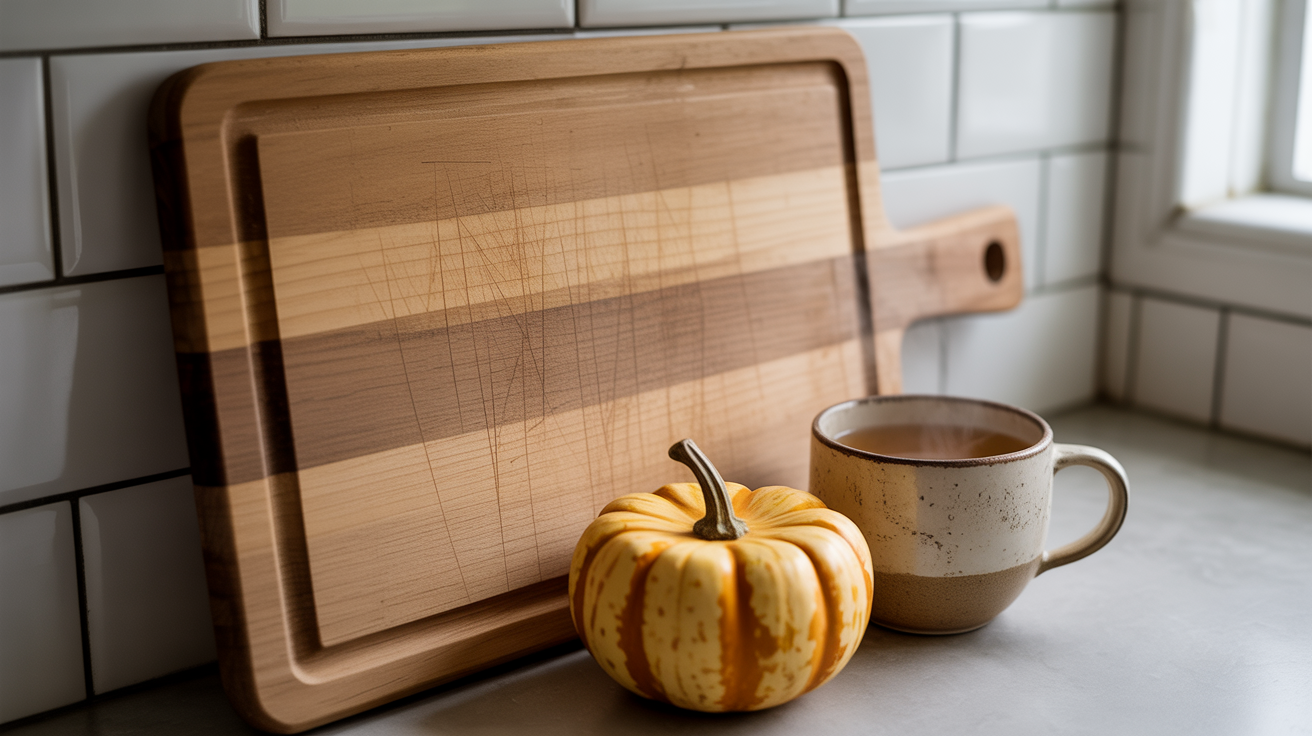 Lean a large wood board against your backsplash and layer it with a fall mug or mini pumpkin.