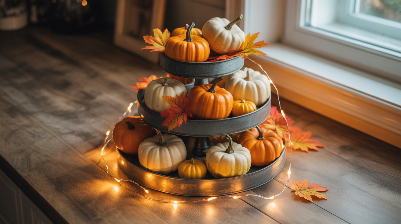 Set a tiered tray on your counter and fill it with mini pumpkins, faux leaves, and a cute fall sign.